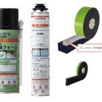 ボード断熱材用接着剤の「PUO10」、木製・輸入樹脂サッシなどのサッシ枠に貼るだけの簡単防水テープ「イルモドトリオプラス」、木製・樹脂サッシなどの下地の動きに追従する1液ウレタンフォーム「インサルエラスティックフォーム」、シロアリの進入を防ぐウレタンフォーム「防蟻フォーム」のご紹介です。