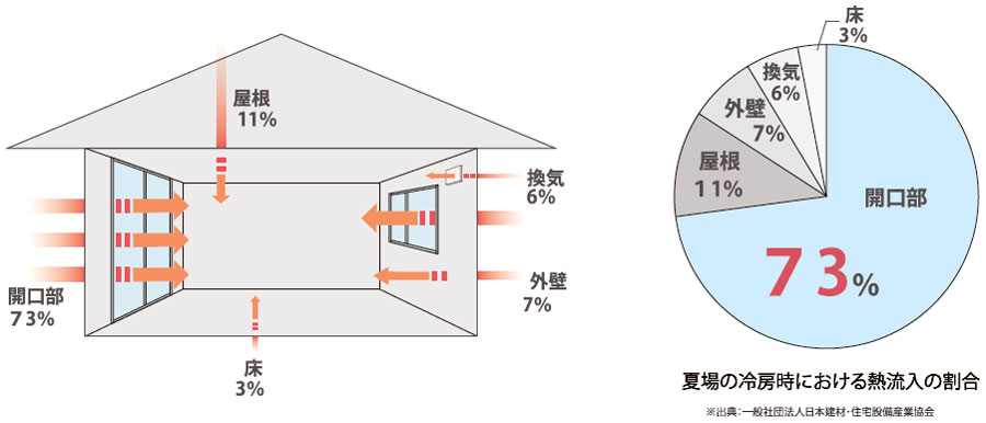 夏場、昼の冷房時に開口部から熱が入る割合は73%に達します。