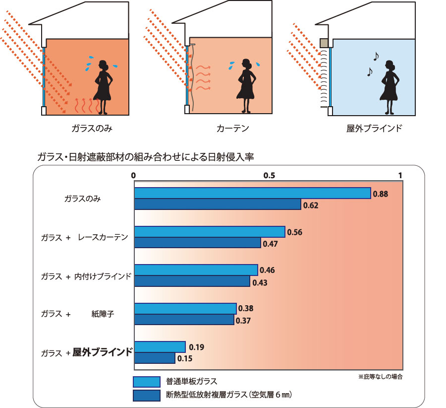屋外で遮蔽した場合、遮蔽部分に当たった熱はそのまま屋外に放出されるため、日射遮蔽効果は格段の差があります。