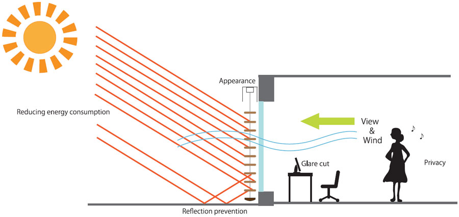 夏期・中間期において建物内に侵入する日射を遮ることにより、太陽熱の過度な流入を抑制します。