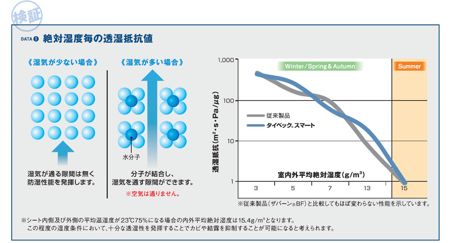 タイベック®スマートは、屋外側の透湿防水シートと組み合わせることで、日本の夏型結露にも対応した可変透湿機能付き気密シートです。