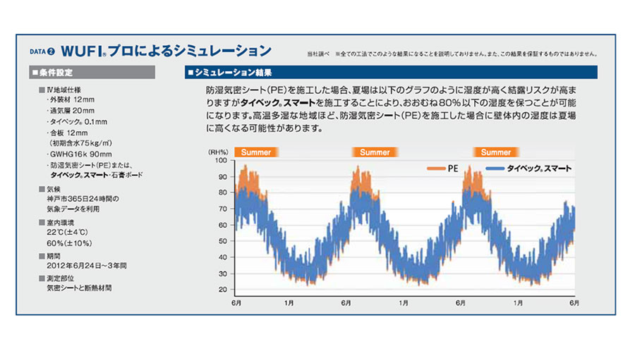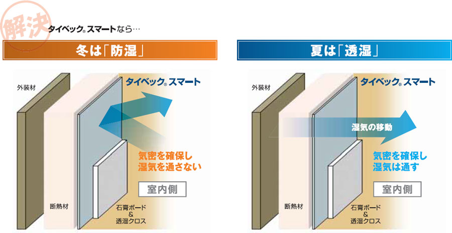 タイベック®スマートは可変透湿機能つきの気密シートです。夏型の結露を抑え気密しながら木材の乾燥を促し、冬は防湿効果を発揮します。