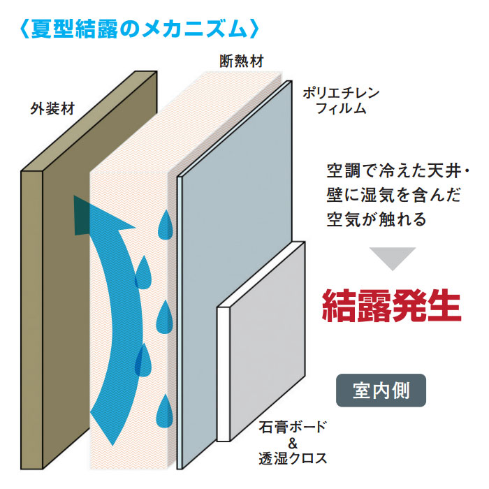 高温高湿の夏期を持つ日本(特にⅢ~Ⅴ地域)の高気密性住宅では夏型結露のリスクをはらんでいます。