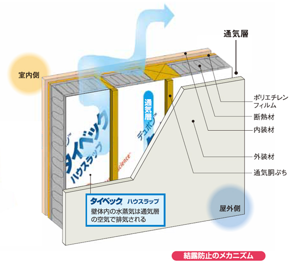 また、優れた性能を充分に発揮させるため、壁の内側からの湿気が通気層を通り抜けて効果的に湿気を排出する「通気層構法」を推奨しています。
