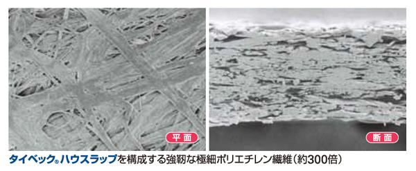 タイベック®ハウスラップは、無数に存在する繊維の隙間から湿気が抜けていくため、結露を防ぎ、木材や断熱材の乾燥状態を保ちます。