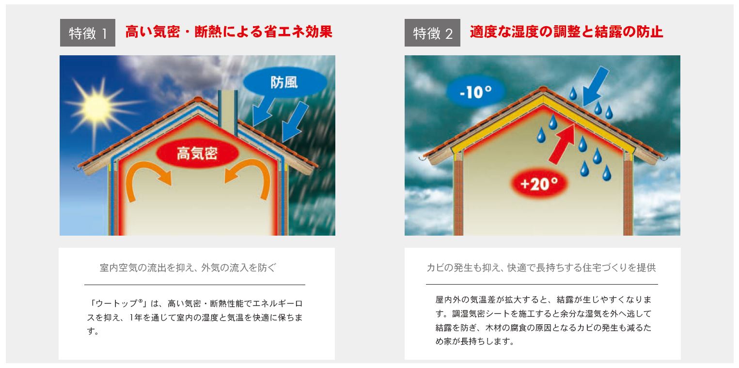 高気密・高断熱を実現するウルト社のシート製品「ウ―トップ®」。エネルギーロスとなる空気の流出・流入を防ぎ、空調機器の使用を抑えます。