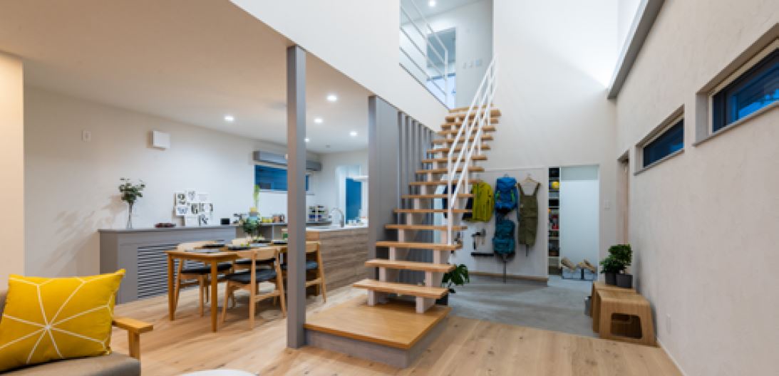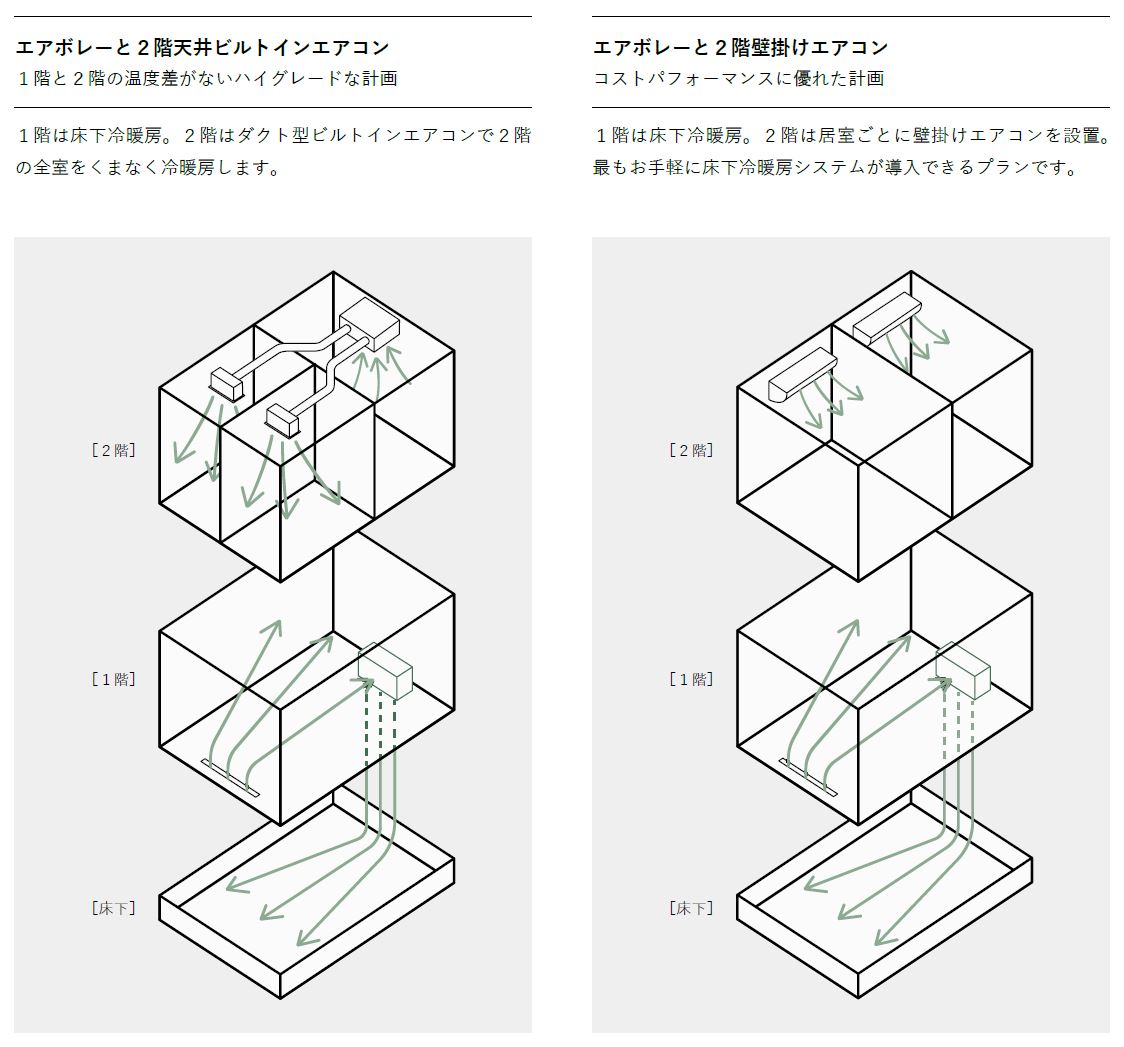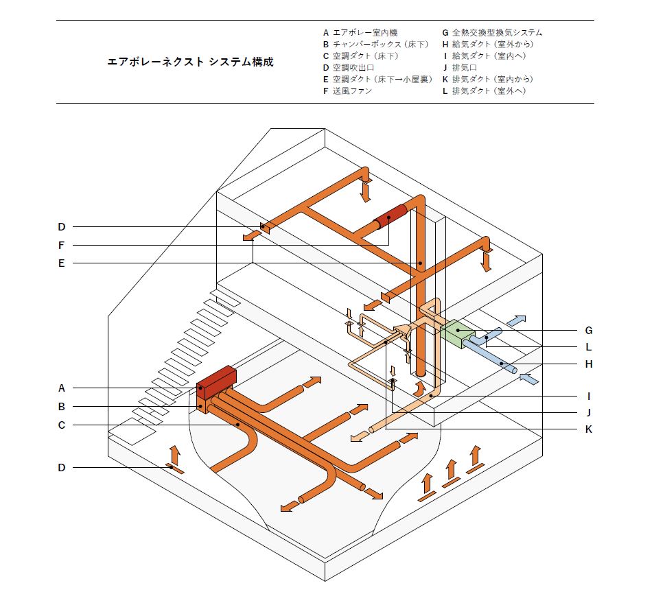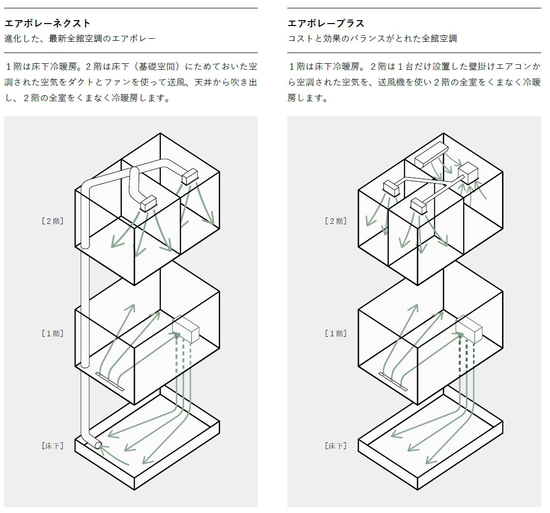 床下冷暖房型 全館空調システム・airvolleyNEXT(エアボレーネクスト)。1台の空調機器で、1階は床下から2階は天井から冷暖房を行い、建物全体で一定の室温を保ちます。airvolleyNEXTは住宅を、健康と快適に満ちた住まいに昇華します。