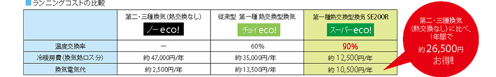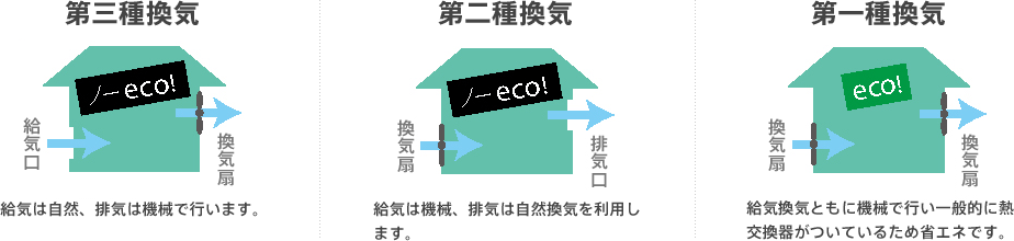 暖房器具で温めた(冷房器具で冷ました)室内空気の熱エネルギーを排気によって捨ててしまう第二種・第三種換気に比べ、
