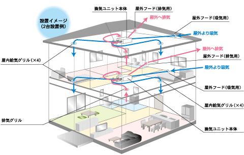 2003年7月施行のシックハウス規制(換気回数0.5回/h以上の換気設備の設置義務化)によって換気設備は